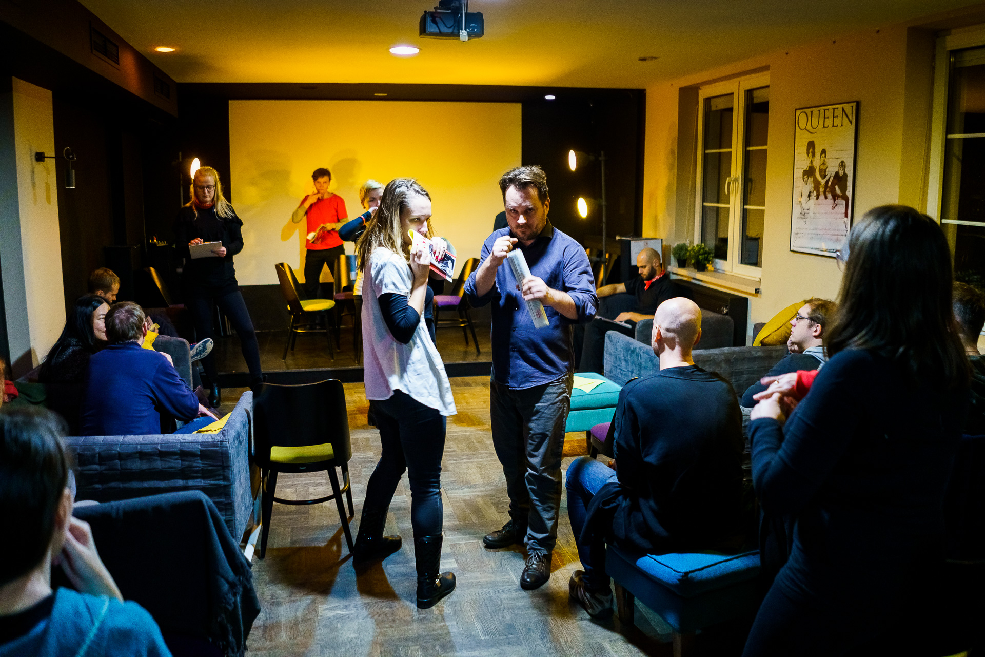 Zdjęcie wykonane podczas premier y spektaklu "Wolna Niepodległa" przedstawia 3 osoby aktorskie siedzące przy stole i jedną stojącą która mówi coś do jednej z siedzących miejsc.
